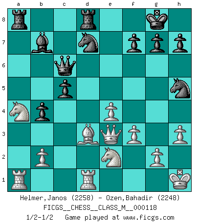 Last move : 1/2-1/2 2023 February 18 1:55:24 [Event "FICGS__CHESS__CLASS_M__000118"] [Site "FICGS"] [Date "2023.02.06"] [Round "1"] [White "Helmer,Janos"] [Black "Ozen,Bahadir"] [Result "1/2-1/2"] [WhiteElo "2258"] [BlackElo "2248"] 1.Nf3 d5 2.d4 Nf6 3.c4 e6 4.Nc3 c6 5.e3 Nbd7 6.Qc2 Bd6 7.Bd3 O-O 8.O-O dxc4 9.Bxc4 b5 10.Bd3 Bb7 11.a3 a5 12.e4 e5 13.Rd1 Qc7 14.h3 Rfd8 15.Be3 exd4 16.Nxd4 b4 17.Na4 Bh2+ 18.Kh1 Bf4 19.Bxf4 Qxf4 20.f3 Nh5 21.Qf2 c5 22.Ne2 Qf6 23.Qe3 Qc6 24.axb4 axb4 1/2-1/2 Follow this game move after move (download)I don't believe in psychology. I believe in good moves. (Bobby Fischer) Wenn Schach ein enormer Dschungel ist, der seine Myriaden von Geheimnissen nicht preisgeben will, dann sind Computer die Kettensägen einer gewaltigen ökologisch unsensiblen Nutzholzfirma. (Nigel Short) Yo nunca en mi vida he jugado la Defensa Francesa, que viene siendo la más aburrida de todas las Aperturas. (Wilhelm Steinitz) Donnez-moi un Cavalier en 6e et je gagnerais toutes mes parties. (Steinitz) History is a gallery of pictures in which there are few originals and many copies. (Alexis de Tocqueville)