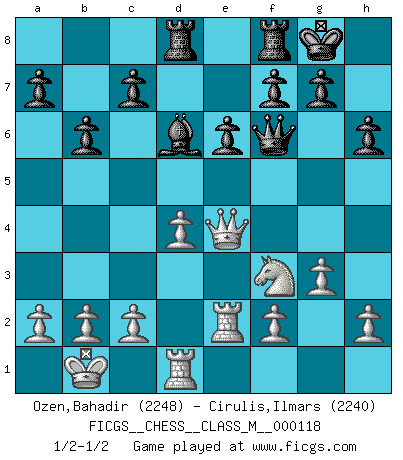Last move : 1/2-1/2 2023 February 20 8:22:33 [Event "FICGS__CHESS__CLASS_M__000118"] [Site "FICGS"] [Date "2023.02.06"] [Round "1"] [White "Ozen,Bahadir"] [Black "Cirulis,Ilmars"] [Result "1/2-1/2"] [WhiteElo "2248"] [BlackElo "2240"] 1.e4 e6 2.d4 d5 3.Nc3 Nf6 4.Bg5 dxe4 5.Nxe4 Nbd7 6.Nf3 h6 7.Nxf6+ Nxf6 8.Be3 Bd6 9.Bd3 O-O 10.Qe2 b6 11.O-O-O Bb7 12.Rhe1 Nd5 13.Bd2 Nf4 14.Bxf4 Bxf4+ 15.Kb1 Qf6 16.Be4 Bxe4 17.Qxe4 Rad8 18.g3 Bd6 19.Re2 1/2-1/2 Follow this game move after move (download)Fischer was a master of clarity and a king of artful positioning. His opponents would see where he was going but were powerless to stop him. (Bruce Pandolfini) Das Schachspiel hat wie die Liebe, die Musik, die Fähigkeit, den Menschen glücklich zu machen. Ich habe ein leises Gefühl des Bedauerns für jeden, der das Schachspiel nicht kennt, so wie ich jeden bedaure, der die Liebe nicht kennt. (Siegbert Tarrasch) ¿Quién es tu oponente esta tarde? Esta tarde mi oponente son las piezas negras. (Akiba Rubinstein) Même un GMI sait rarement calculer sur plus de cinq coups une attaque à sacrifices. (Rudolf Spielmann) I feel so... helpless. (C-3PO in Star Wars ep.3)