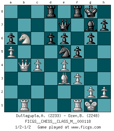 Last move : 1/2-1/2 2023 March 23 17:31:56 [Event "FICGS__CHESS__CLASS_M__000118"] [Site "FICGS"] [Date "2023.02.06"] [Round "1"] [White "Duttagupta,Aniruddha"] [Black "Ozen,Bahadir"] [Result "1/2-1/2"] [WhiteElo "2233"] [BlackElo "2248"] 1.e4 c5 2.Nf3 d6 3.Bb5+ Bd7 4.Bxd7+ Qxd7 5.c4 Nc6 6.d4 cxd4 7.Nxd4 Nf6 8.Nc3 g6 9.f3 Bg7 10.Be3 O-O 11.O-O a6 12.a4 e6 13.Nxc6 bxc6 14.a5 Qe7 15.Na4 Nd7 16.Rb1 c5 17.Qd2 Ne5 18.Nb6 Rad8 19.b4 cxb4 20.Qxb4 f5 1/2-1/2 Follow this game move after move (download)When you absolutely don't know what to do anymore, it is time to panic. (John van der Wiel) Der Vorposten provoziert a) eine Basis für neue Angriffe und b) eine Schwächung der gegnerischen Widerstandskraft in der fraglichen Linie. (Aaron Nimzowitsch) No puedes jugar al Ajedrez si eres de corazón noble. (Proverbio Francés) Je ne crois pas en la psychologie, je crois aux bons coups. (Robert Fischer) The intuitive mind is a sacred gift; the rational mind is a faithful servant. We have created a society that honors the servant but has forgotten the gift. (Albert Einstein)