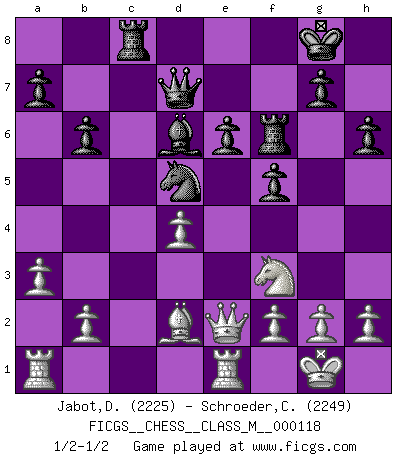 Last move : 1/2-1/2 2023 May 19 18:34:58 [Event "FICGS__CHESS__CLASS_M__000118"] [Site "FICGS"] [Date "2023.02.06"] [Round "1"] [White "Jabot,Daniel"] [Black "Schroeder,Christoph"] [Result "1/2-1/2"] [WhiteElo "2225"] [BlackElo "2249"] 1.e4 e6 2.d4 d5 3.Nc3 dxe4 4.Nxe4 Nd7 5.Nf3 Ngf6 6.Nxf6+ Nxf6 7.Bd3 c5 8.Be3 Qc7 9.c3 Bd6 10.O-O O-O 11.Qe2 b6 12.Bg5 Nd5 13.Qe4 f5 14.Qe2 h6 15.Bd2 Rf6 16.Rfe1 Bb7 17.Ba6 Bxa6 18.Qxa6 cxd4 19.cxd4 Qd7 20.Qe2 Rc8 21.a3 1/2-1/2 Follow this game move after move (download)If cunning alone were needed to excel, women would be the best Chess players. (Albin) Der Verteidiger gebe der Gewalt nach, aber nur der Gewalt. Er schaffe sich nicht freiwillig, etwa aus Blindheit oder aus Schrecken, irgendwelche Schwächen. Er lasse sich nicht bluffen. (Emanuel Lasker) Bobby Fischer es el jugador de Ajedrez mas grande que jamás haya existido. (Ken Smith) Il n'y a pas de prix trop élevé au scalp de l'ennemi. (Koblentz) Art disturbs, science reassures. (Georges Braque, Le Jour et la Nuit)