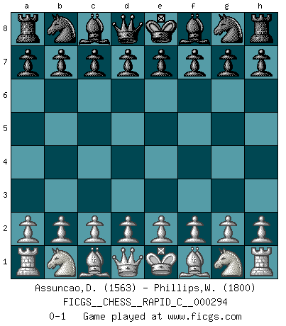 Last move : 0-1 2023 March 9 12:11:39 [Event "FICGS__CHESS__RAPID_C__000294"] [Site "FICGS"] [Date "2023.02.07"] [Round "1"] [White "Assuncao,Danilo"] [Black "Phillips,Wendell"] [Result "0-1"] [WhiteElo "1563"] [BlackElo "1800"] 0-1 This chess game has been lost on time (started : 2023.02.07 1:47:12) Follow this game move after move (download)No price is too great for the scalp of the enemy King. (Koblentz) Gewinnen beim Schach fördert das Selbstvertrauen. Beim Sex spüre ich sowas nicht... (Garry Kasparov) Aquel que ve no otra dirección en el juego que la de dar Jaque Mate a su oponente, nunca será un buen jugador de Ajedrez. (Euwe) On croit qu'il y a plus de mauvais joueurs que de bons joueurs, c'est faux : Il y a autant de joueurs qui gagnent que de joueurs qui perdent. (Philippe Geluck) Now the reason the enlightened prince and the wise general conquer the enemy whenever they move and their achievements surpass those of ordinary men is foreknowledge. (Sun Tzu)