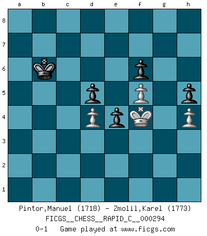 Last move : 0-1 2023 February 23 13:8:39 [Event "FICGS__CHESS__RAPID_C__000294"] [Site "FICGS"] [Date "2023.02.07"] [Round "1"] [White "Pintor,Manuel"] [Black "Zmolil,Karel"] [Result "0-1"] [WhiteElo "1718"] [BlackElo "1773"] 1.e4 e6 2.f4 d5 3.exd5 exd5 4.Nf3 Nf6 5.d4 Ne4 6.Bd3 Bg4 7.O-O Nd7 8.Nc3 Nxc3 9.bxc3 Nf6 10.Qe1+ Be7 11.Ne5 Bc8 12.Qg3 O-O 13.f5 Kh8 14.Qh3 Ne4 15.Be3 Bg5 16.Rf3 Bxe3+ 17.Rxe3 Qg5 18.Rf1 g6 19.g4 gxf5 20.Kh1 f6 21.Bxe4 fxe4 22.Rg3 Be6 23.Nf3 Qg6 24.Nh4 Qg5 25.Nf5 Rg8 26.Qg2 Rae8 27.h4 Qg6 28.Qf2 Rgf8 29.Qf4 Bxf5 30.gxf5 Qf7 31.Rfg1 Rg8 32.Qh6 Rxg3 33.Rxg3 Rg8 34.Rxg8+ Kxg8 35.Kg2 Qg7+ 36.Qxg7+ Kxg7 37.Kg3 h5 38.a4 Kf7 39.c4 c6 40.Kf4 Ke7 41.a5 Kd6 42.c5+ Kc7 43.c4 b6 44.cxd5 cxd5 45.axb6+ axb6 46.cxb6+ Kxb6 0-1 Follow this game move after move (download)You cannot play at Chess if you are kind-hearted. (French Proverb) Computer sind die einzigen Gegner, die nicht immer eine Ausrede auf Lager haben, wenn sie gegen mich verlieren. (Robert James Fischer) Ciertamente el estado mental actual de Bobby Fischer es una tragedia. Uno de los mas grandes jugadores de Ajedrez del mundo -el orgullo y pena del Ajedrez Americano. (Frank Brady) Les échecs sont un jeu terrible. Si vous n'avez pas le centre, votre adversaire a une position plus libre. Par contre, si vous avez le centre, alors vous avez vraiment quelque chose pour laquelle vous inquiéter ! (Siegbert Tarrasch) Every vice is only an exaggeration of a necessary and virtuous function. (Ralph Waldo Emerson, Journals 1936)