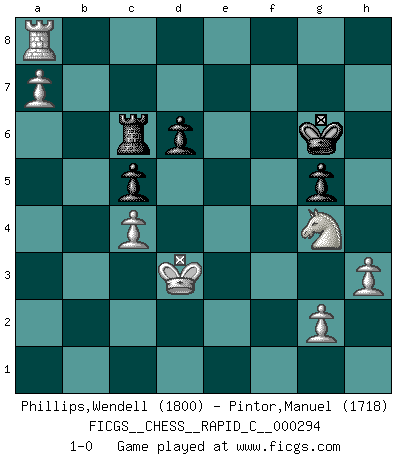 Last move : 1-0 2023 February 14 12:45:26 [Event "FICGS__CHESS__RAPID_C__000294"] [Site "FICGS"] [Date "2023.02.07"] [Round "1"] [White "Phillips,Wendell"] [Black "Pintor,Manuel"] [Result "1-0"] [WhiteElo "1800"] [BlackElo "1718"] 1.d3 e5 2.e4 Nc6 3.c3 Bc5 4.Nf3 h6 5.h3 d6 6.Be2 Nf6 7.Nbd2 O-O 8.Nf1 a6 9.Ng3 Kh7 10.Bd2 Ne7 11.Qc1 a5 12.Nh2 Ng6 13.Ng4 Be6 14.Bxh6 gxh6 15.Qxh6+ Kg8 16.Nf5 Bxf2+ 17.Kxf2 Bxf5 18.exf5 Nh7 19.fxg6 fxg6 20.Ke1 Qg5 21.Qxg5 Nxg5 22.Rf1 Kg7 23.Rxf8 Rxf8 24.Kd2 e4 25.dxe4 Nxe4+ 26.Ke3 Ng3 27.Bf3 b5 28.Bc6 b4 29.Rd1 Rf5 30.Rd5 Nf1+ 31.Kd3 Rf4 32.Rxa5 bxc3 33.bxc3 Ng3 34.Ra7 Rf7 35.a4 g5 36.a5 Nf5 37.Rb7 Ne7 38.Bf3 Nc8 39.a6 c5 40.Rb8 Na7 41.c4 Kg6 42.Bb7 Rc7 43.Ra8 Nc6 44.Bxc6 Rxc6 45.a7 1-0 Follow this game move after move (download)Look at Garry Kasparov. After he loses, invariably he wins the next game. He just kills the next guy. That's something that we have to learn to be able to do. (Maurice Ashley) Drei Punkte vor allen anderen ist wie einer, der im weißen Anzug posiert, während der Rest in Müllsäcke gekleidet dasteht. (Viktor Kortschnoi) ¿Se han dado cuenta de que Fischer casi nunca ha tenido piezas malas? El las intercambia y las piezas malas se quedan con sus oponenets. (Yuri Balashov) Il n'y a pas eu de défaite parce que je ne crois pas que cet ordinateur ait jamais existé. IBM a triché en refusant d'imprimer les modes de recherche de la machine. C'est évident, pendant le match, des coups décisifs ont été joués par des êtres humains. Aujourd'hui, les meilleurs spécialistes en informatique ne peuvent toujours pas expliquer comment Deep-Blue a pu jouer contre la logique des ordinateurs. IBM a gagné une guerre de communication, mais ils sont incapables de prouver que l'ordinateur a gagné tout seul. (Garry Kasparov) Life is pleasant. Death is peaceful. It's the transition that's troublesome. (Isaac Asimov)