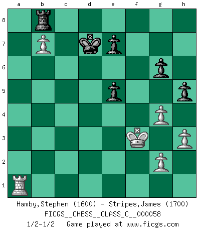 Last move : 1/2-1/2 2008 July 11 15:17:53 [Event "FICGS__CHESS__CLASS_C__000058"] [Site "FICGS"] [Date "2007.08.24"] [Round "1"] [White "Hamby,Stephen"] [Black "Stripes,James"] [Result "1/2-1/2"] [WhiteElo "1600"] [BlackElo "1700"] 1.d4 Nf6 2.c4 g6 3.Nc3 d5 4.cxd5 Nxd5 5.e4 Nxc3 6.bxc3 Bg7 7.Bc4 c5 8.Ne2 O-O 9.O-O Nc6 10.Be3 Qc7 11.Rc1 Rd8 12.Bf4 Be5 13.Bg3 Bxg3 14.fxg3 Ne5 15.Bd5 Bg4 16.Rb1 cxd4 17.Rxb7 Qc8 18.Qxd4 Rxd5 19.Qxd5 Bxe2 20.Rfb1 Nc6 21.c4 Bg4 22.h3 Be6 23.Qc5 h5 24.a4 f6 25.a5 Bf7 26.R1b5 Be8 27.a6 Qe6 28.Qd5 Kf7 29.Kf2 Rd8 30.Qxe6+ Kxe6 31.Rd5 Ra8 32.Rc5 Nd8 33.R5c7 Nxb7 34.axb7 Rb8 35.c5 a5 36.c6 Bxc6 37.Rxc6+ Kd7 38.Rb6 a4 39.e5 fxe5 40.Kf3 a3 41.g4 a2 42.Ra6 a1Q 43.Rxa1 1/2-1/2 King's Indian defense, 3.Nc3 Kingside Castling by player Black (move 8) Kingside Castling by player White (move 9) Promotion Queen by player Black (move 42) This chess game ended in a draw. Follow this game move after move (download)Only the player with the initiative has the right to attack. (Wilhelm Steinitz) Mit sehr nachdenklichem Gesicht schreitet Bobby durch den Turniersaal. Was ist passiert?, fragt Lombardy. Ich stehe schlecht, antwortet Fischer. Lombardy: Dann biete doch einfach Remis an. Fischer: So schlecht stehe ich nun auch wieder nicht! (Robert James Fischer) La táctica fluye a partir de una posición superior. (Bobby Fischer) Lorsque vous vous retrouvez devant une position atroce, ne tendez pas un ultime piège dérisoire avec l'intention d'abandonner si l'adversaire le déjoue ! Faites-vous plutôt un devoir de résister comme si votre vie en dépendait. Jouez le coup qui vous déplairait au centuple si vous étiez dans la peau de votre tortionnaire ! If you work for a living, why do you kill yourself working ? (Tuco to a chicken in The Good, The Bad and The Ugly)