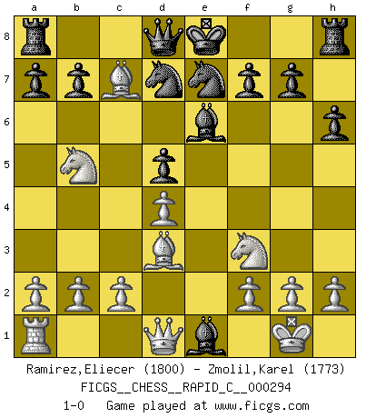 Last move : 1-0 2023 February 10 16:16:37 [Event "FICGS__CHESS__RAPID_C__000294"] [Site "FICGS"] [Date "2023.02.07"] [Round "1"] [White "Ramirez,Eliecer"] [Black "Zmolil,Karel"] [Result "1-0"] [WhiteElo "1800"] [BlackElo "1773"] 1.e4 e6 2.d4 d5 3.exd5 exd5 4.Bd3 h6 5.Nf3 Bd6 6.O-O Be6 7.Re1 Ne7 8.Nc3 Nd7 9.Nb5 Bb4 10.Bf4 Bxe1 11.Bxc7 1-0 Follow this game move after move (download)I feel as if I were a piece in a game of Chess, when my opponent says of it: That piece cannot be moved. (Soren Kierkegaard) Schach ist das Spiel, das die Verrückten gesund hält. (Albert Einstein) Si pudieramos observar el interior de la cabeza de un jugador de Ajedrez, encontraríamos ahí un mundo lleno de sentimientos, imágenes, ideas, emoción y pasión. (Alfred Binet) Les échecs sont un jeu par leur forme, un art par leur essence et une science par sa difficulté d'acquisition. Ils peuvent vous procurer autant de plaisir qu'un bon livre ou une belle musique, mais vous n'aurez une réelle joie que si vous arrivez à bien jouer. (Tigran Petrosian) The only thing that matters is the evidence. (Horatio Caine, C.S.I. Miami)