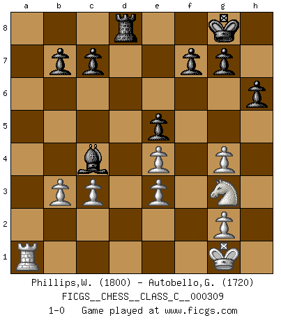 Last move : 1-0 2023 June 8 20:10:27 [Event "FICGS__CHESS__CLASS_C__000309"] [Site "FICGS"] [Date "2023.02.07"] [Round "1"] [White "Phillips,Wendell"] [Black "Autobello,Giovanni"] [Result "1-0"] [WhiteElo "1800"] [BlackElo "1720"] 1.d3 Nf6 2.e4 e5 3.Be2 Nc6 4.c3 d5 5.Nd2 Bd6 6.h3 O-O 7.Qc2 Be6 8.Nf1 a5 9.Ng3 h6 10.Nf3 dxe4 11.dxe4 a4 12.Be3 Qe7 13.Qc1 Rfd8 14.Nh2 Bc5 15.Ng4 Bxe3 16.Qxe3 Nxg4 17.hxg4 Na5 18.O-O Nc4 19.Bxc4 Bxc4 20.Rfe1 Rd3 21.Qc1 Qc5 22.Re3 Rxe3 23.Qxe3 Qxe3 24.fxe3 Rd8 25.b3 axb3 26.axb3 1-0 This chess game has been lost on time (started : 2023.02.07 15:32:8) Follow this game move after move (download)I guess a certain amount of temperament is expected of Chess geniuses. (Ron Gross) Gewöhnliche Menschen denken nur daran, wie sie ihre Zeit verbringen. Ein intelligenter Mensch versucht, sie auszunutzen. (Arthur Schopenhauer) Ayuda a tus piezas para que ellas te puedan ayudar. (Paul Morphy) La vérité est comme le meilleur coup aux échecs : elle existe, mais il faut la chercher. (Arturo Perez-Reverte) Strategy without tactics is the slowest route to victory. Tactics without strategy is the noise before defeat. (Sun Tzu)
