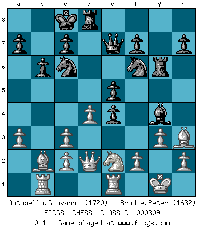 Last move : 0-1 2023 May 22 16:15:19 [Event "FICGS__CHESS__CLASS_C__000309"] [Site "FICGS"] [Date "2023.02.07"] [Round "1"] [White "Autobello,Giovanni"] [Black "Brodie,Peter"] [Result "0-1"] [WhiteElo "1720"] [BlackElo "1632"] 1.e4 e6 2.Nc3 d5 3.d4 Bb4 4.a3 Bxc3+ 5.bxc3 dxe4 6.Qg4 Nf6 7.Qxg7 Rg8 8.Qh6 Rg6 9.Qd2 Nc6 10.g3 Bd7 11.Bg2 e5 12.Ne2 Qe7 13.O-O Bg4 14.Bb2 O-O-O 15.Rab1 b6 16.Rfe1 Bf3 17.Bh3+ Bg4 0-1 This chess game has been lost on time (started : 2023.02.07 15:32:8) Follow this game move after move (download)Pawns are born free, yet they are everywhere in chains. (Rick Kennedy) Gott hat gewollt, dass ich Champion werde. (Surab Azmajparaschvili) Una buena ofensiva y una buena defensa, comienzan ambas con un buen desarrollo. (Bruce A. Moon) La menace est plus forte que l'exécution. (Aaron Nimzovitch) Establishing goals is all right if you don't let them deprive you of interesting detours. (Doug Larson)