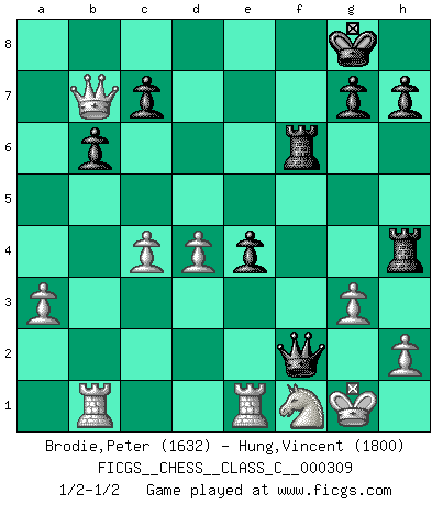 Last move : 1/2-1/2 2023 March 15 2:53:22 [Event "FICGS__CHESS__CLASS_C__000309"] [Site "FICGS"] [Date "2023.02.07"] [Round "1"] [White "Brodie,Peter"] [Black "Hung,Vincent"] [Result "1/2-1/2"] [WhiteElo "1632"] [BlackElo "1800"] 1.d4 Nf6 2.Nf3 b6 3.c4 e6 4.Nc3 Bb4 5.Bd2 Bb7 6.e3 O-O 7.Be2 d5 8.a3 Bxc3 9.Bxc3 Ne4 10.O-O Nxc3 11.bxc3 Nd7 12.cxd5 exd5 13.Qc2 Nf6 14.Bd3 Ne4 15.Bxe4 dxe4 16.Nd2 f5 17.Rab1 Qg5 18.Nc4 f4 19.exf4 Rxf4 20.Ne3 Raf8 21.c4 R8f6 22.g3 Rh6 23.Rfe1 Rfh4 24.Nf1 Qg4 25.Qa4 Rf6 26.Qxa7 Qf3 27.Qxb7 Qxf2+ 28.Kh1 Qf3+ 29.Kg1 Qf2+ 30.Kh1 Qf3+ 31.Kg1 Qf2+ 1/2-1/2 Follow this game move after move (download)Blessed be the memory of him who gave the world this immortal game. (A. G. Gardiner) Wenn man heute mit 14 Jahren noch kein GM ist, kann man es vergessen. (Viswanathan Anand) Los asuntos humanos son como una partida de Ajedrez: solo aquellos que no lo toman seriamente, pueden ser llamados buenos jugadores. (Hung Tzu Ch'eng) Mon pion favori sur ma case favorite ! Bronstein en parlant d'un coup de pion en h5 quand il avait les Noirs. That's absurd. I love it. (Gregory House, House M.D.)