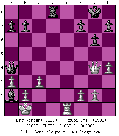 Last move : 0-1 2023 March 10 8:4:29 [Event "FICGS__CHESS__CLASS_C__000309"] [Site "FICGS"] [Date "2023.02.07"] [Round "1"] [White "Hung,Vincent"] [Black "Roubik,Vit"] [Result "0-1"] [WhiteElo "1800"] [BlackElo "1938"] 1.e4 c5 2.Nf3 Nc6 3.d4 cxd4 4.Nxd4 g6 5.Nc3 Bg7 6.Be3 Nf6 7.Be2 O-O 8.Qd2 d5 9.exd5 Nxd5 10.Nxd5 Nxd4 11.Nxe7+ Qxe7 12.Bxd4 Bxd4 13.Qxd4 Re8 14.Qd2 Bg4 15.O-O-O Bxe2 16.Rde1 Rad8 17.Qf4 Qc5 18.h4 Rc8 19.c3 Qa5 20.Kb1 Bd3+ 21.Ka1 Rxe1+ 22.Rxe1 Bc4 23.a3 Qa4 24.Qg4 Rd8 25.Kb1 Ba2+ 0-1 Follow this game move after move (download)Fischer wanted to give the Russians a taste of their own medicine. (Larry Evans) Mit Schach schule ich mein Gefühl für Geometrie, was für Tennis und Schach gleichermaßen wichtig ist. (Boris Becker) Un mal plan es mejor que no tener ningún plan. (Frank Marshall) L'attaque fait le spectacle, la défense gagne les matchs. (Dicton footballistique) Hold em is to stud what chess is to checkers. (Johnny Moss)