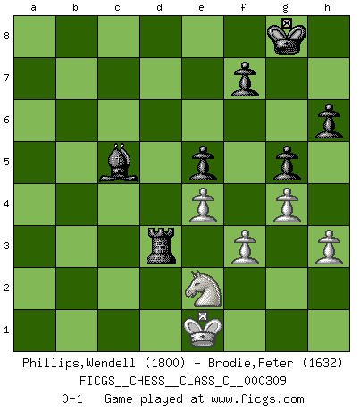 Last move : 0-1 2023 March 9 10:8:30 [Event "FICGS__CHESS__CLASS_C__000309"] [Site "FICGS"] [Date "2023.02.07"] [Round "1"] [White "Phillips,Wendell"] [Black "Brodie,Peter"] [Result "0-1"] [WhiteElo "1800"] [BlackElo "1632"] 1.d3 d5 2.Nd2 e5 3.e4 Nf6 4.Be2 Nc6 5.c3 Be7 6.h3 O-O 7.Qc2 Qd6 8.Nf1 Be6 9.Ng3 dxe4 10.dxe4 Rad8 11.Nf3 Qc5 12.Qb1 Bc4 13.Be3 Qb5 14.Qc2 Bxe2 15.Qxe2 Qxe2+ 16.Kxe2 Bd6 17.Bg5 Be7 18.b4 h6 19.Be3 Bd6 20.a3 b5 21.Rhd1 Rfe8 22.Rd2 a5 23.Ne1 Ra8 24.Rda2 Ra6 25.Nd3 Rea8 26.Bd2 axb4 27.cxb4 Nd4+ 28.Kd1 Nb3 29.Rb1 Nxd2 30.Kxd2 Rc6 31.f3 Rc4 32.Rba1 g6 33.Ne2 Nd7 34.Nb2 Rc6 35.Nd3 Nb6 36.Nb2 Nc4+ 37.Nxc4 Rxc4 38.Nc3 c6 39.Ne2 Be7 40.Kd3 Rd8+ 41.Ke3 c5 42.Rb1 cxb4 43.axb4 Bxb4 44.Kf2 Bc5+ 45.Ke1 b4 46.Rab2 Be3 47.Rxb4 Rxb4 48.Rxb4 Bd2+ 49.Kf2 Bxb4 50.g4 Bc5+ 51.Kf1 Rd1+ 52.Kg2 Rd2 53.Kf1 g5 54.Ke1 Rd3 0-1 Follow this game move after move (download)Chess is as much a mystery as women. (Purdy) Ein Schachgenie ist jemand der verdammt gut Schach spielt. (Jonathan Levitt) Ayuda a tus piezas para que ellas te puedan ayudar. (Paul Morphy) À la honte des hommes, on sait que les lois du jeu sont les seules qui soient partout justes, claires, inviolables et exécutées. Pourquoi l'Indien qui a donné les règles du jeu d'échecs est-il obéi de bon gré dans toute la terre, et que les décrétales des papes, par exemple, sont aujourd'hui un objet d'horreur et de mépris ? C'est que l'inventeur des échecs combina tout avec justesse pour la satisfaction des joueurs, et que les papes, dans leurs décrétales, n'eurent en vue que leur seul avantage. L'Indien voulut exercer également l'esprit des hommes et leur donner du plaisir; les papes ont voulu abrutir l'esprit des hommes. Voltaire (Dictionnaire philosophique / Garnier 1967) A woman without a man is like a fish without a bicycle. (Gloria Steinem)