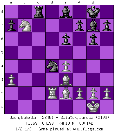 Last move : 1/2-1/2 2023 March 12 20:34:35 [Event "FICGS__CHESS__RAPID_M__000142"] [Site "FICGS"] [Date "2023.02.12"] [Round "1"] [White "Ozen,Bahadir"] [Black "Swiatek,Janusz"] [Result "1/2-1/2"] [WhiteElo "2248"] [BlackElo "2199"] 1.Nf3 c5 2.c4 Nf6 3.Nc3 d5 4.cxd5 Nxd5 5.d4 Nxc3 6.bxc3 g6 7.e4 Bg7 8.Be3 Qa5 9.Qd2 O-O 10.Rc1 cxd4 11.cxd4 Qxd2+ 12.Nxd2 e6 13.Nb3 Bd7 14.Be2 Nc6 15.O-O Rfd8 16.Rfd1 Nb4 17.Rd2 Rac8 18.Rxc8 Rxc8 19.Nc5 Be8 20.a3 Nc6 21.Nxb7 Nxd4 1/2-1/2 Follow this game move after move (download)When you play Bobby, it is not a question if you win or lose. It is a question if you survive. (Boris Spassky) Es gibt zwei Arten von Opfern: Korrekte und meine. (Mikhail Nekhemyevich Tal) Es el objetivo de la escuela moderna no tratar cada posición de acuerdo a una regla general, sino de acuerdo al principio inherente en la posición. (Richard Reti) Mais l'homme est une créature légère et illogique : semblable au joueur d'échecs, il n'aime que le processus du but à atteindre, non le but lui-même. (Dostoïevsky) Men never do evil so completely and cheerfully as when they do it from religious conviction. (Blaise Pascal)