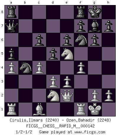 Last move : 1/2-1/2 2023 March 3 20:25:49 [Event "FICGS__CHESS__RAPID_M__000142"] [Site "FICGS"] [Date "2023.02.12"] [Round "1"] [White "Cirulis,Ilmars"] [Black "Ozen,Bahadir"] [Result "1/2-1/2"] [WhiteElo "2240"] [BlackElo "2248"] 1.f4 d5 2.Nf3 Nf6 3.e3 g6 4.b4 Bg4 5.Be2 e6 6.a3 a5 7.b5 Bg7 8.a4 O-O 9.O-O c6 10.bxc6 bxc6 11.Ne5 Bxe2 12.Qxe2 Qb6 13.c4 Na6 14.d3 Nb4 15.Nd2 Qa7 1/2-1/2 Follow this game move after move (download)You have to have the fighting spirit. You have to force moves and take chances. (Bobby Fischer) Matt entspricht nicht immer den Tatsachen. (Savielly Grigorievitsch Tartakower) ¡Examina movidas que hagan daño! Un buen ojo for movidas desvastantes es mucho mas importante que el conocimiento de principios estratégicos. (Purdy) Si rien de grave n'est détecté lors de l'analyse d'une position, on joue alors le coup. Seconde règle de Blumenfeld. There are two kinds of people in the world, my friend. Those who have a loaded gun and those who dig. You dig ! (Blondie in The Good, The Bad and The Ugly)