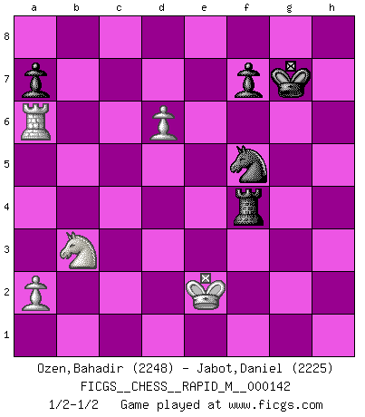 Last move : 1/2-1/2 2023 April 26 15:29:12 [Event "FICGS__CHESS__RAPID_M__000142"] [Site "FICGS"] [Date "2023.02.12"] [Round "1"] [White "Ozen,Bahadir"] [Black "Jabot,Daniel"] [Result "1/2-1/2"] [WhiteElo "2248"] [BlackElo "2225"] 1.Nf3 Nf6 2.g3 g6 3.Bg2 Bg7 4.d4 O-O 5.c4 d5 6.O-O dxc4 7.Na3 c3 8.bxc3 c5 9.Re1 Nd5 10.Bd2 Nc6 11.e4 Nb6 12.d5 Na5 13.Qc1 Nac4 14.Bh6 e6 15.Nxc4 Nxc4 16.h4 exd5 17.exd5 Bxh6 18.Qxh6 Qf6 19.Ng5 Qg7 20.Qxg7+ Kxg7 21.Re7 h6 22.Ne4 Rd8 23.Nxc5 Nd6 24.Rae1 Kf8 25.c4 b6 26.Nb3 Rd7 27.Rxd7 Bxd7 28.Bf1 g5 29.hxg5 hxg5 30.Bd3 Rc8 31.Rc1 Bf5 32.Bxf5 Nxf5 33.Kf1 Nd6 34.c5 bxc5 35.Rxc5 Ke7 36.Ke2 Kf6 37.f4 gxf4 38.gxf4 Re8+ 39.Kf3 Nf5 40.Ra5 Re3+ 41.Kf2 Re4 42.Ra6+ Kg7 43.d6 Rxf4+ 44.Ke2 1/2-1/2 Follow this game move after move (download)Chess is 99 percent tactics. (Teichmann) Nie in meinem Leben habe ich die französische Verteidigung gespielt, welche die Stumpfsinnigste von allen ist. (Wilhelm Steinitz) Solo los afeminados hacen el Enroque. (Rob Sillars) Le jeu d'échecs fait naître et fortifie en nous plusieurs qualités précieuses dans le cours de l'existence, telles que la prévoyance, la circonspection, la prudence, et la persévérance. (Benjamin Franklin - 1783, la morale des échecs) Life is the sum of all your choices. (Albert Camus)