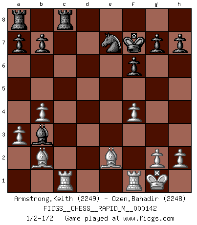 Last move : 1/2-1/2 2023 March 27 3:2:0 [Event "FICGS__CHESS__RAPID_M__000142"] [Site "FICGS"] [Date "2023.02.12"] [Round "1"] [White "Armstrong,Keith"] [Black "Ozen,Bahadir"] [Result "1/2-1/2"] [WhiteElo "2249"] [BlackElo "2248"] 1.Nf3 d5 2.d4 Nf6 3.c4 c6 4.e3 e6 5.b3 c5 6.cxd5 Nxd5 7.Bb2 cxd4 8.Nxd4 e5 9.Nb5 Bb4+ 10.N1c3 Be6 11.a3 Bxc3+ 12.Nxc3 Nc6 13.Nxd5 Qxd5 14.b4 f6 15.Qxd5 Bxd5 16.Be2 Ne7 17.O-O Kf7 18.f4 Rhc8 19.Rac1 exf4 20.exf4 Bb3 1/2-1/2 Follow this game move after move (download)When you are lonely, when you feel yourself an alien in the world, play Chess. This will raise your spirits and be your counselor in war. (Aristotle) Alles was am Schachbrett zählt sind gute Züge. (Robert James Fischer) Es muy difícil jugar en contra de la teoría de Einstein. - en su primera derrota en contra de Fischer (Mikhail Tal) Les erreurs sont comme les malheurs, elles n'arrivent jamais seules. (Siegbert Tarrasch) Vladimir Ras-Putin is still alive... He is also a good actor, I saw him in the Lord of the Rings. (Rodolfo d'Ettorre)