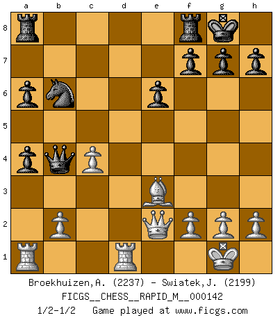 Last move : 1/2-1/2 2023 May 3 13:11:2 [Event "FICGS__CHESS__RAPID_M__000142"] [Site "FICGS"] [Date "2023.02.12"] [Round "1"] [White "Broekhuizen,A. T. S."] [Black "Swiatek,Janusz"] [Result "1/2-1/2"] [WhiteElo "2237"] [BlackElo "2199"] 1.e4 e6 2.d4 d5 3.Nd2 c5 4.Ngf3 cxd4 5.exd5 Qxd5 6.Bc4 Qd7 7.O-O Nc6 8.Nb3 Nf6 9.Nbxd4 Nxd4 10.Nxd4 a6 11.Re1 b5 12.Bb3 Bb7 13.c3 Be7 14.Qe2 Bd5 15.Bxd5 Nxd5 16.a4 bxa4 17.Rd1 O-O 18.c4 Nb6 19.Nf5 Qb7 20.Nxe7+ Qxe7 21.Be3 Qb4 1/2-1/2 Follow this game move after move (download)War is the child of passion, passion is the child of narcissism and narcissism is the child. (...) Another game ? (Thibault de Vassal) Ich habe die besten Aussichten, den ersten Preis zu gewinnen - denn jeder muss gegen Steinitz spielen, nur ich nicht! (Wilhelm Steinitz) En la perfecta combinación de Ajedrez como en una historia corta de primera clase, toda la trama y contra trama deberá conducir hacia un final sorprendente, el interes no es mitigado hasta el último momento. (Yates and Winter) Les échecs sont utiles à l'exercice de la faculté de penser et à celle de l'imagination. Car nous devons posséder une méthode élaborée pour atteindre des buts partout où nous devons conduire notre raison. (Leibnitz) The faster the computer, the slower the brain. (Thibault de Vassal)