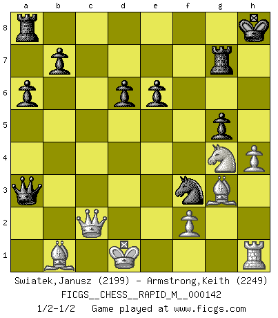 Last move : 1/2-1/2 2023 May 2 11:12:24 [Event "FICGS__CHESS__RAPID_M__000142"] [Site "FICGS"] [Date "2023.02.12"] [Round "1"] [White "Swiatek,Janusz"] [Black "Armstrong,Keith"] [Result "1/2-1/2"] [WhiteElo "2199"] [BlackElo "2249"] 1.e4 c5 2.Nf3 d6 3.d4 cxd4 4.Nxd4 Nf6 5.Nc3 a6 6.Be3 Ng4 7.Bg5 h6 8.Bh4 g5 9.Bg3 Bg7 10.h3 Ne5 11.Nf5 Bxf5 12.exf5 Nbc6 13.Nd5 e6 14.fxe6 fxe6 15.Ne3 Qa5+ 16.c3 Nf3+ 17.gxf3 Bxc3+ 18.bxc3 Qxc3+ 19.Qd2 Qxa1+ 20.Nd1 Qd4 21.Bd3 O-O 22.Qe2 Qf6 23.Qe4 Rf7 24.Ne3 Nd4 25.Ng4 Nxf3+ 26.Kd1 Qa1+ 27.Bb1 Kh8 28.Nxh6 Rg7 29.Ng4 Qb2 30.Qc2 Qb4 31.a3 Qxa3 32.h4 1/2-1/2 Follow this game move after move (download)Chess is imagination. (David Bronstein) Wenn es im Universum noch irgendwo intelligente Lebewesen gibt, dann kennen sie Go. (Emanuel Lasker) Jugadores de primera clase pierden en contra de jugadores de segunda clase porque los jugadores de segunda clase a veces juegan una partida de primer clase. (Siegbert Tarrasch) Avant la finale, les dieux ont créé le milieu de partie. (Tarrasch) A good book on your shelf is a friend that turns its back on you and remains a friend. (Author unknown)