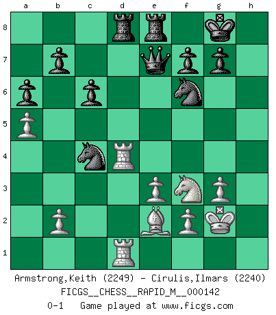 Last move : 0-1 2023 May 1 4:12:22 [Event "FICGS__CHESS__RAPID_M__000142"] [Site "FICGS"] [Date "2023.02.12"] [Round "1"] [White "Armstrong,Keith"] [Black "Cirulis,Ilmars"] [Result "0-1"] [WhiteElo "2249"] [BlackElo "2240"] 1.Nf3 d5 2.d4 Nf6 3.c4 c6 4.e3 Bf5 5.Nc3 e6 6.Nh4 Bg6 7.Be2 Nbd7 8.O-O Bd6 9.g3 O-O 10.Nxg6 hxg6 11.Qc2 Rc8 12.Rd1 Re8 13.Bd2 Qe7 14.Rac1 a6 15.a3 Bb8 16.a4 Bd6 17.Qb3 Rb8 18.a5 g5 19.Kg2 dxc4 20.Qxc4 Bb4 21.Ne4 Bxd2 22.Nxd2 g4 23.h3 gxh3+ 24.Kxh3 e5 25.Kg2 Rbd8 26.Nf3 exd4 27.Rxd4 Ne5 28.Rcd1 Nxc4 0-1 Follow this game move after move (download)It was clear to me that the vulnerable point of the American Grandmaster (Bobby Fischer) was in double-edged, hanging, irrational positions, where he often failed to find a win even in a won position. (Efim Geller) Es ist schade, dass viele Schachsportler vergessen, wie wichtig Auftreten und angemessene Kleidung sind. (Alexandra Kosteniuk) Los errores estan ahí, esperando a que se cometan. (Savielly Tartakower) Les échecs c'est le défi de l'alpiniste, toujours plus haut, prêt à tout pour monter à l'assaut du Roi ennemi. Les échecs, c'est de la musique en mouvement, un ballet majestueux pour les yeux. C'est de la poésie composée par les fantômes du passé qui au même titre que Rimbaud ou Verlaine méritent notre admiration. Les échecs, c'est de la peinture ou le moindre mouvement modifie le tableau pour en faire un Picasso ou un Van Gogh. Les échecs, c'est tout et rien, c'est la vie et la mort. Jjulie33 sur le forum de France-Echecs. They misunderestimated me. (George W. Bush, Bentonville nov. 6, 2000)