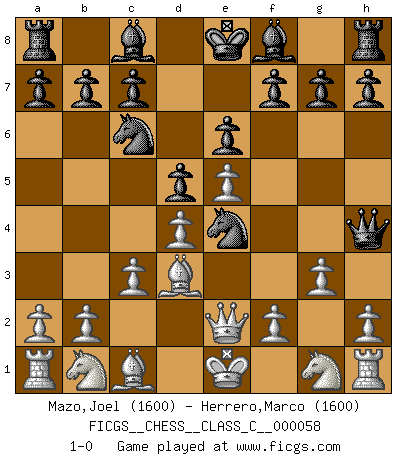Last move : 1-0 2007 October 10 6:10:40 [Event "FICGS__CHESS__CLASS_C__000058"] [Site "FICGS"] [Date "2007.08.24"] [Round "1"] [White "Mazo,Joel"] [Black "Herrero,Marco"] [Result "1-0"] [WhiteElo "1600"] [BlackElo "1600"] 1.e4 Nf6 2.e5 Ne4 3.d4 e6 4.Bd3 d5 5.Qe2 Nc6 6.c3 Qh4 7.g3 1-0 This chess game has been lost on time (started : 2007.08.24 17:49:0) Alekhine's defense : Mokele Mbembe (Buecker) variation Player White won this chess game. Follow this game move after move (download)Examine moves that smite! A good eye for smites is far more important than a knowledge of strategical principles. (Purdy) Ja, ich habe einmal eine Blitzpartie gespielt, es war in einem Zug, 1929. --im Interview 1989 (Mikhail Moiseyevich Botvinik) Dejen al perfeccionista jugar por correo. (Yasser Seirawan) Les échecs, c'est l'imagination. (David Bronstein) If computers get too powerful, we can organize them into committees. That'll do them in. (Anonymous)