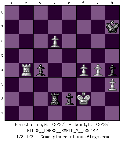 Last move : 1/2-1/2 2023 August 29 11:12:34 [Event "FICGS__CHESS__RAPID_M__000142"] [Site "FICGS"] [Date "2023.02.12"] [Round "1"] [White "Broekhuizen,A. T. S."] [Black "Jabot,Daniel"] [Result "1/2-1/2"] [WhiteElo "2237"] [BlackElo "2225"] 1.e4 c5 2.Nf3 d6 3.d4 cxd4 4.Nxd4 Nf6 5.Nc3 a6 6.Be2 e5 7.Nb3 Be7 8.Be3 Be6 9.Nd5 Nbd7 10.Qd3 O-O 11.O-O Bxd5 12.exd5 Ne8 13.Rad1 Bg5 14.Bxg5 Qxg5 15.Na5 Rb8 16.c4 f5 17.b4 Ndf6 18.Qc2 e4 19.f4 Qg6 20.a4 h5 21.Qb3 Qf7 22.c5 Kh7 23.Rd2 Qc7 24.Qe3 Ng4 25.Qd4 Rf7 26.Nc4 Rd8 27.a5 Ngf6 28.Nb6 Qe7 29.Rc2 Nc7 30.Rd1 g6 31.Qe3 Qf8 32.h3 Qe7 33.c6 bxc6 34.Rxc6 Qf8 35.Bc4 h4 36.Be2 Re7 37.Rdc1 Nfe8 38.Kh2 Qf7 39.Rd1 Qf6 40.Na4 Qg7 41.Nc3 Nf6 42.Kg1 Nh5 43.Bxh5 gxh5 44.Qf2 Qf6 45.Rc1 e3 46.Qe2 Kh6 47.Qd3 Qg6 48.Ne2 Rg7 49.g3 R8d7 50.b5 axb5 51.a6 Kh7 52.Rb6 Rg8 53.R1c6 Ra8 54.Rb7 Qf7 55.Nd4 Nxa6 56.Rxd7 Qxd7 57.Ne6 Kg8 58.Qxf5 Qa7 59.Qg5+ Kh8 60.Qh6+ Kg8 61.Qg6+ Kh8 62.Qh6+ Kg8 63.Kg2 Nc5 64.Qg6+ Kh8 65.Qxh5+ Qh7 66.Qxh7+ Kxh7 67.Nxc5 dxc5 68.g4 Ra2+ 69.Kf3 e2 70.Kf2 b4 71.Rb6 Rd2 72.d6 c4 73.Rxb4 1/2-1/2 Follow this game move after move (download)A man without frontiers. He didn't divide the East and the West, he brought them together in their admiration for him. (Ljubomir Ljubojevic, about Bobby Fischer's death) Ich bin es gewohnt, das die Jugend mir überhaupt keinen Respekt entgegenbringt. (Alexander Morozewich) EL Ajedrez es como la vida. (Boris Spassky) La tactique, c'est ce que vous faites quand il y a quelque chose à faire; la stratégie, c'est ce que vous faites quand il n'y a rien à faire. (Savielli Tartacower) Chess is everything: art, science and sport. (Anatoly Karpov)
