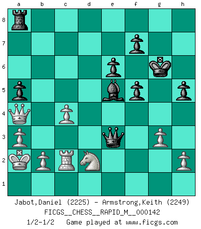 Last move : 1/2-1/2 2023 May 19 11:1:0 [Event "FICGS__CHESS__RAPID_M__000142"] [Site "FICGS"] [Date "2023.02.12"] [Round "1"] [White "Jabot,Daniel"] [Black "Armstrong,Keith"] [Result "1/2-1/2"] [WhiteElo "2225"] [BlackElo "2249"] 1.e4 c5 2.Nf3 d6 3.d4 cxd4 4.Nxd4 Nf6 5.Nc3 a6 6.Bg5 e6 7.f4 Qb6 8.Qd2 Nc6 9.Bxf6 gxf6 10.Nb3 Qc7 11.O-O-O b5 12.Kb1 b4 13.Ne2 Bb7 14.Ned4 Bh6 15.Bd3 d5 16.Nxc6 Bxf4 17.Qxb4 Bxc6 18.exd5 Bxd5 19.Rhe1 Bd6 20.Qh4 Be5 21.Be4 Bxe4 22.Rxe4 Rd8 23.R4e1 O-O 24.c3 Rxd1+ 25.Rxd1 f5 26.g3 a5 27.Qa4 Ra8 28.a3 h5 29.Ka2 Qb6 30.Rd2 Kg7 31.Rc2 Kg6 32.c4 Qe3 33.Nd2 1/2-1/2 Follow this game move after move (download)Chess is thirty to forty percent psychology. You don't have this when you play a computer. I can't confuse it. (Judith Polgar) Wir können eben der zündenden Macht des Opfers nicht wiederstehen, denn die Begeisterung für das Opfer liegt in der Natur des Menschen. (Rudolf Spielmann) Evita las multitudes. Haz independientemente tu propio razonamiento. Trata de ser el jugador de Ajedrez, no la pieza de Ajedrez. (Ralph Charell) À la honte des hommes, on sait que les lois du jeu sont les seules qui soient partout justes, claires, inviolables et exécutées. Pourquoi l'Indien qui a donné les règles du jeu d'échecs est-il obéi de bon gré dans toute la terre, et que les décrétales des papes, par exemple, sont aujourd'hui un objet d'horreur et de mépris ? C'est que l'inventeur des échecs combina tout avec justesse pour la satisfaction des joueurs, et que les papes, dans leurs décrétales, n'eurent en vue que leur seul avantage. L'Indien voulut exercer également l'esprit des hommes et leur donner du plaisir; les papes ont voulu abrutir l'esprit des hommes. Voltaire (Dictionnaire philosophique / Garnier 1967) You think that education is too expensive ? Try ignorance. (Derek Bok)