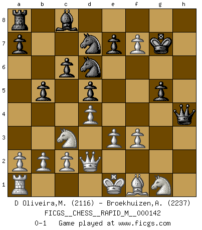 Last move : 0-1 2023 May 17 15:19:53 [Event "FICGS__CHESS__RAPID_M__000142"] [Site "FICGS"] [Date "2023.02.12"] [Round "1"] [White "D Oliveira,Marcos Arruda"] [Black "Broekhuizen,A. T. S."] [Result "0-1"] [WhiteElo "2116"] [BlackElo "2237"] 1.d4 Nf6 2.Bf4 g6 3.Nc3 d5 4.Qd2 Bg7 5.Bh6 O-O 6.Bxg7 Kxg7 7.e3 Nbd7 8.h3 c6 9.g4 b5 10.g5 Ne8 11.h4 Nd6 12.f3 Rh8 13.h5 h6 14.hxg6 hxg5 15.Rxh8 Qxh8 16.gxf7 Qh4+ 0-1 This chess game has been lost on time (started : 2023.02.12 23:18:54) Follow this game move after move (download)The only thing Chess players have in common is Chess. (Lodewijk Prins) Wenn man heute mit 14 Jahren noch kein GM ist, kann man es vergessen. (Viswanathan Anand) A través de las casillas del tablero, los Indios explican el movimiento del tiempo y la edad, las influencias mas altas que controlan el mundo y los lazos que vinculan al Ajedrez con el alma humana. (Al-Masudi) Ce n'est pas pour s'amuser qu'il joue aux échecs : il célèbre un culte. (Vladimir Nabokov) The real voyage of discovery consists not in seeking new lands but in seeing with new eyes. (Marcel Proust)