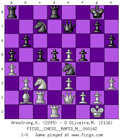 Last move : 1-0 2023 April 21 10:3:7 [Event "FICGS__CHESS__RAPID_M__000142"] [Site "FICGS"] [Date "2023.02.12"] [Round "1"] [White "Armstrong,Keith"] [Black "D Oliveira,Marcos Arruda"] [Result "1-0"] [WhiteElo "2249"] [BlackElo "2116"] 1.Nf3 d5 2.d4 Nf6 3.c4 c6 4.e3 e6 5.b3 Nbd7 6.Bb2 Bd6 7.Bd3 O-O 8.Nbd2 b6 9.O-O Bb7 10.Qe2 c5 11.Rad1 Ne4 12.cxd5 exd5 13.h3 Qe7 14.Ba6 Ndf6 15.Bxb7 Qxb7 16.Rc1 Rfd8 17.Rc2 a5 18.a4 h6 19.Rfc1 Qe7 20.Nb1 Ne8 21.Nc3 Nc7 22.Rd1 f5 23.Ne5 Bxe5 24.dxe5 1-0 This chess game has been lost on time (started : 2023.02.12 23:18:54) Follow this game move after move (download)Your body has to be in top condition. Your Chess deteriorates as your body does. You can't separate body from mind. (Bobby Fischer) Offener Brief an US-Präsident Bush anlässlich der Verhaftung Bobby Fishers: Verhaften Sie mich. Stecken Sie mich in dieselbe Zelle wie Bobby Fisher und geben Sie uns ein Schachspiel mit. (Boris Vassilievich Spassky) Estaba muy claro de que el punto vulnerable del Gran Maestro Americano (Bobby Fischer) radicaba en las posiciones de doble filo, colgantes, irracionales, donde el siempre falló en encontrar un triunfo aún en una posición de clara victoria. (Efim Geller) Vous savez, camarade Pachman, je n'éprouve pas de plaisir à être ministre, je jouerais plutôt aux échecs comme vous, ou alors ferais une révolution au Venezuela. (Che Guevara à Ludek Pachman, 'Checkmate in Prague', 1975) The Internet isn't free. It just has an economy that makes no sense to capitalism. (Brad Shapcott)