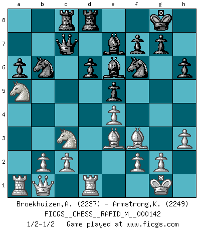 Last move : 1/2-1/2 2023 March 27 5:6:44 [Event "FICGS__CHESS__RAPID_M__000142"] [Site "FICGS"] [Date "2023.02.12"] [Round "1"] [White "Broekhuizen,A. T. S."] [Black "Armstrong,Keith"] [Result "1/2-1/2"] [WhiteElo "2237"] [BlackElo "2249"] 1.e4 c5 2.Nf3 d6 3.d4 cxd4 4.Nxd4 Nf6 5.Nc3 a6 6.Be2 e5 7.Nb3 Be7 8.O-O O-O 9.Bf3 Be6 10.Be3 Nbd7 11.a4 Qc7 12.Re1 Rfc8 13.a5 h6 14.h3 b5 15.axb6 Nxb6 16.Na5 Rab8 17.Qc1 Rd8 18.Rd1 Rbc8 19.Qb1 Rb8 20.Qc1 Rbc8 21.Qb1 1/2-1/2 Follow this game move after move (download)I had a toothache during the first game. In the second game I had a headache. In the third game it was an attack of rheumatism. In the fourth game, I wasn't feeling well. And in the fifth game? Well, must one have to win every game ? (Siegbert Tarrasch) Ich könnte leicht behaupten: Ja,ja, Leonid Breschnew wollte nicht, daß ich Weltmeister werde. In der Tat war die Sache komplizierter. (Viktor Kortschnoi) El arma más poderosa en el Ajedrez, es tener la próxima movida. (David Bronstein) Mais l'homme est une créature légère et illogique : semblable au joueur d'échecs, il n'aime que le processus du but à atteindre, non le but lui-même. (Dostoïevsky) Fortune favours the audacious. (Desiderius Erasmus)