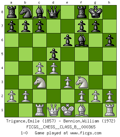 Last move : 1-0 2023 April 30 13:54:38 [Event "FICGS__CHESS__CLASS_B__000365"] [Site "FICGS"] [Date "2023.02.18"] [Round "1"] [White "Trigance,Emile"] [Black "Bennion,William"] [Result "1-0"] [WhiteElo "1857"] [BlackElo "1972"] 1.d4 d5 2.c4 e6 3.Nc3 Be7 4.Nf3 Nf6 5.Bg5 h6 6.Bxf6 Bxf6 7.e3 O-O 8.Rc1 1-0 This chess game has been lost on time (started : 2023.02.18 7:27:13) Follow this game move after move (download)All I want to do, ever, is just play Chess. (Bobby Fischer) Ohne ihre Erfolge schmälern zu wollen würde ich sagen Petrosian, Spassky und Karpov verdanken ihre Siege ihren Trainern - Boleslavsky, Bondarevsky und Furman. (Mikhail Moiseyevich Botvinik) Desconfianza es la característica mas necesaria de un jugador de Ajedrez. (Siegbert Tarrasch) L'action d'une oeuvre littéraire se déroule sur un champ de bataille. Les masques et les types du drame moderne correspondent aux pièces du jeu d'échecs. L'intrigue correspond aux coups et aux gambits, c'est à dire aux techniques du jeu telles qu'utilisées et interprétées par les joueurs. Les tactiques et les péripéties [mouvements] correspondent aux coups exécutés par l'adversaire. (Viktor Shklovsky) The mind is like a parachute, it only functions when its open. (Unknown)