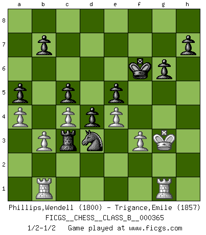 Last move : 1/2-1/2 2023 June 3 18:45:41 [Event "FICGS__CHESS__CLASS_B__000365"] [Site "FICGS"] [Date "2023.02.18"] [Round "1"] [White "Phillips,Wendell"] [Black "Trigance,Emile"] [Result "1/2-1/2"] [WhiteElo "1800"] [BlackElo "1857"] 1.d3 d5 2.Nd2 e5 3.e4 Nf6 4.Be2 c5 5.c3 Nc6 6.h3 Be7 7.Qc2 Be6 8.Nf1 a5 9.a4 O-O 10.Ng3 d4 11.Nf3 Bd6 12.Bd2 Rb8 13.Qc1 Re8 14.Bg5 Be7 15.c4 Nd7 16.Bd2 Bf6 17.b3 g6 18.h4 Bg4 19.h5 Nf8 20.hxg6 fxg6 21.Bh6 Re7 22.Bg5 Rf7 23.Bxf6 Qxf6 24.Qg5 Bxf3 25.Qxf6 Rxf6 26.Bxf3 Ne6 27.Ne2 Rbf8 28.Kd2 Ng5 29.Ng1 Nb4 30.Rb1 Nxf3+ 31.Nxf3 Rxf3 32.gxf3 Rxf3 33.Ke2 Rxd3 34.Rhg1 Rc3 35.Rg5 Nc6 36.Rg3 Rc2+ 37.Ke1 Nb4 38.Rg5 Nc6 39.f3 Rc3 40.Kf2 Kf7 41.R5g1 Nb4 42.Rg5 Kf6 43.R5g1 Nd3+ 44.Kg3 Nf4 45.Rb2 Nd3 46.R2b1 Nf4 47.Rb2 Nd3 48.R2b1 1/2-1/2 Follow this game move after move (download)The passed Pawn is a criminal, who should be kept under lock and key. Mild measures, such as police surveillance, are not sufficient. (Aaron Nimzovich) Die Idee von Capablanca, Schach als Fach in den Schulen zu lehren, ist großartig. (Fidel Castro) Yo creo que el Ajedrez posee una magia que es también una ayuda en la edad avanzada. Una rodilla reumática es olvidada durante una partida de Ajedrez y otros eventos pueden parecer algo sin importancia comparada a una catástrofe en el tablero de Ajedrez. (Vlastimil Hort) Le joueur d'Echecs qui veut atteindre le top est obligé de développer son propre credo créatif. Alexeï Stepanovicth Souétine. Il est facile d'écrire des livres ! Ce qui est difficile, c'est de jouer ! (Alexeï Stepanovicth Souétine) Who needs drugs and alcohol if he can play Big Chess at FICGS ? (Heinz-Georg Lehnhoff)