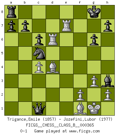 Last move : 0-1 2023 June 7 15:46:9 [Event "FICGS__CHESS__CLASS_B__000365"] [Site "FICGS"] [Date "2023.02.18"] [Round "1"] [White "Trigance,Emile"] [Black "Jozefini,Lubor"] [Result "0-1"] [WhiteElo "1857"] [BlackElo "1977"] 1.d4 f5 2.c4 Nf6 3.g3 g6 4.Bg2 Bg7 5.Nf3 O-O 6.O-O d6 7.Nc3 c6 8.d5 e5 9.dxe6 Bxe6 10.Qd3 Re8 11.Bf4 Ne4 12.Rad1 Na6 13.Nxe4 fxe4 14.Qxe4 Bf5 15.Qxe8+ Qxe8 16.Nd4 Bxd4 17.Rxd4 Qxe2 18.Rxd6 Qxb2 19.Re1 Nc5 20.Be5 Qxa2 21.Bd4 Qd2 22.Re7 Qc1+ 23.Bf1 Bh3 0-1 Follow this game move after move (download)A strong memory, concentration, imagination, and a strong will is required to become a great Chess player. (Bobby Fischer) Ja, jede Frau in Holland liebt mich bestimmt, und alle Männer hassen mich. (Loek van Wely) Bobby es el jugador de Ajedrez mas fino que este país jamás haya producido. Su memoria para las movidas, su brillantez en soñar combinaciones y su feróz determinación por la victoria son algo extraño. (John Collins) Les erreurs sont comme les malheurs, elles n'arrivent jamais seules. (Siegbert Tarrasch) Optimism is a variety of information deficit. Sometimes especially true for correspondence chess games. (Michael Aigner)
