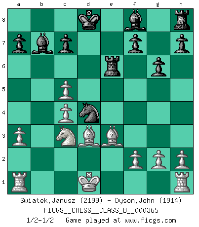 Last move : 1/2-1/2 2023 March 27 11:54:57 [Event "FICGS__CHESS__CLASS_B__000365"] [Site "FICGS"] [Date "2023.02.18"] [Round "1"] [White "Swiatek,Janusz"] [Black "Dyson,John"] [Result "1/2-1/2"] [WhiteElo "2199"] [BlackElo "1914"] 1.e4 e5 2.Nf3 Nc6 3.d4 exd4 4.Nxd4 Nf6 5.Nxc6 bxc6 6.e5 Qe7 7.Qe2 Nd5 8.c4 Ba6 9.Qe4 Nb4 10.Nc3 Rd8 11.Kd1 d6 12.exd6 Rxd6+ 13.Bd2 Re6 14.Qf3 c5 15.Qa8+ Qd8 16.Qxd8+ Kxd8 17.a3 Nc6 18.b4 Nd4 19.Be3 g6 20.Bd3 Bb7 21.bxc5 1/2-1/2 Follow this game move after move (download)We must make sure that Chess will not be like a dead language, very interesting, but for a very small group. (Sytze Faber) Der 70jährige Viktor Kortschnoi: Die Rentenanstalt wollte mich zwingen in Rente zu gehen. Meine Frau erhält jetzt eine Pension- und ich zahle weiter in die Rentenkasse ein! (Viktor Kortschnoi) En el Ajedrez, tal como es jugado por los Maestros, practicamente la suerte es eliminada. (Emanuel Lasker) Les écrivains ont utilisé les échecs pour analyser les côtés extrêmes de la nature humaine. Dans ce cadre, les échecs offrent un champ d'expérimentation idéal. Mais on pourrait faire la même chose avec la peinture. Et là, en vous référant à Van Gogh, vous ne tirerez pas de conclusion définitive sur les peintres. (Gary Kasparov) Shallow men believe in luck. Strong men belive in cause and effect. (Ralph Waldo Emerson)