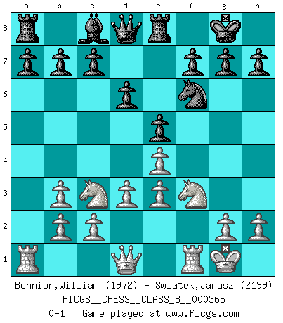 Last move : 0-1 2023 May 24 8:39:35 [Event "FICGS__CHESS__CLASS_B__000365"] [Site "FICGS"] [Date "2023.02.18"] [Round "1"] [White "Bennion,William"] [Black "Swiatek,Janusz"] [Result "0-1"] [WhiteElo "1972"] [BlackElo "2199"] 1.e4 e5 2.Nf3 Nc6 3.Bc4 Nf6 4.d3 Bc5 5.O-O d6 6.Be3 Bxe3 7.fxe3 Na5 8.Bb3 Nxb3 9.axb3 O-O 10.Nc3 Re8 0-1 This chess game has been lost on time (started : 2023.02.18 7:27:13) Follow this game move after move (download)Chess is a beautiful mistress. (Bent Larsen) Woher wissen wir, daß der Neanderthaler Blindschach gespielt hat? -- Bei Ausgrabungen wurden keine Schachbretter und Figuren gefunden. (Anonymous) Botvinnik trataba de restarle el misterio al Ajedrez, siempre relacionandolo a situaciones de la vida ordinaria. El gustaba de llamar al Ajedrez un típico problema inexacto similar a aquellos de los cuales la gente siempre tiene que enfrentarse en la vida cotidiana. (Garry Kasparov) Nous vivons dans un monde échiquéen : chaque jour qui passe est un défi à relever. (Philosophe Sasha) Art is not a thing, it is a way. (Elbert Hubbard)