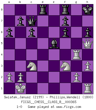 Last move : 1-0 2023 March 19 21:16:29 [Event "FICGS__CHESS__CLASS_B__000365"] [Site "FICGS"] [Date "2023.02.18"] [Round "1"] [White "Swiatek,Janusz"] [Black "Phillips,Wendell"] [Result "1-0"] [WhiteElo "2199"] [BlackElo "1800"] 1.e4 d6 2.d4 c6 3.Nf3 Qc7 4.c4 e5 5.Nc3 h6 6.h3 Be7 7.Be3 Nd7 8.Qc2 Nf8 9.c5 Ng6 10.O-O-O Nf6 11.cxd6 Bxd6 12.dxe5 Nxe5 13.Nd4 O-O 14.f4 Ng6 15.e5 Nxe5 16.fxe5 Bxe5 17.Kb1 a6 18.Bd3 Bd7 19.Bf2 Rad8 20.Nf3 Bd6 21.Bd4 Be6 22.Bxf6 gxf6 23.Bf5 Bxf5 24.Qxf5 Kg7 25.Rd4 Be5 26.Rg4+ Kh8 27.Qh5 1-0 Follow this game move after move (download)A good sacrifice is one that is not necessarily sound but leaves your opponent dazed and confused. (Rudolph Spielmann) Jeder Fehler erscheint unglaublich dumm, wenn andre ihn begehen. (Georg Christoph Lichtenberg) El Ajedrez es el arte del análisis. (Mikhail Botvinnik) Pour se monter efficace, un Cavalier a besoin d'avant-postes ! Les Cavaliers font les meilleurs bloqueurs de pions passés. The project of the man are lower than those of the sky. (Chinese proverb)