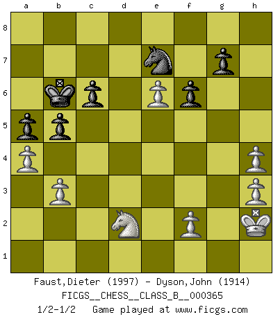 Last move : 1/2-1/2 2023 April 10 10:34:48 [Event "FICGS__CHESS__CLASS_B__000365"] [Site "FICGS"] [Date "2023.02.18"] [Round "1"] [White "Faust,Dieter"] [Black "Dyson,John"] [Result "1/2-1/2"] [WhiteElo "1997"] [BlackElo "1914"] 1.e4 e5 2.Nf3 Nc6 3.Bb5 Nf6 4.O-O Nxe4 5.d4 Nd6 6.Bxc6 dxc6 7.dxe5 Nf5 8.Qxd8+ Kxd8 9.b3 Bd7 10.Nbd2 a5 11.a4 c5 12.Bb2 Be7 13.Ne4 Kc8 14.Rfe1 Ra6 15.Ba3 Rc6 16.Rad1 b6 17.h3 h5 18.Nc3 c4 19.Bxe7 cxb3 20.Rd3 Nxe7 21.cxb3 Bf5 22.Rde3 Rd8 23.Nb5 Rc5 24.Nfd4 Bg6 25.e6 f6 26.Rg3 Kb8 27.Rd1 Kb7 28.Kh2 R8d5 29.Rd2 c6 30.Nc3 h4 31.Rxg6 Nxg6 32.Nxd5 Rxd5 33.Nf3 Rxd2 34.Nxd2 b5 35.g3 Kb6 36.gxh4 Ne7 1/2-1/2 Follow this game move after move (download)If you aren't afraid of Spassky, then I have removed the element of money. (Jim Slater) Wie bekannt hörte Morphy 1859 auf, Schach zu spielen. Seine Enttäuschung galt nicht so sehr dem Schach, wie den Schachspielern. (Robert James Fischer) Aquel que teme a un Peón de Reina aislado, debería de retirarse del Ajedrez. (Siegbert Tarrasch) 'L'échange des dames est un coup dur pour les deux adversaires...' Un journaliste lors d'une partie du match Spassky-Fischer If passion drives you, let reason holds the reins. (Benjamin Franklin)
