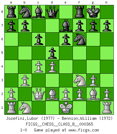Last move : 1-0 2023 April 29 0:48:23 [Event "FICGS__CHESS__CLASS_B__000365"] [Site "FICGS"] [Date "2023.02.18"] [Round "1"] [White "Jozefini,Lubor"] [Black "Bennion,William"] [Result "1-0"] [WhiteElo "1977"] [BlackElo "1972"] 1.d4 d5 2.Nf3 Nf6 3.c4 e6 4.g3 Bb4+ 5.Bd2 Be7 6.Bg2 O-O 7.Qc2 c6 8.b3 1-0 This chess game has been lost on time (started : 2023.02.18 7:27:13) Follow this game move after move (download)We cannot resist the fascination of sacrifice, since a passion for sacrifices is part of a Chessplayer's nature. (Rudolf Spielman) Je mehr ich von der FIDE weiss, um so weniger verstehe ich. (Alexander Kalifman) El Ajedrez es un mar en el cual un mosquito puede beber y un elefante puede bañarse. (Refrán Hindú) À la honte des hommes, on sait que les lois du jeu sont les seules qui soient partout justes, claires, inviolables et exécutées. Pourquoi l'Indien qui a donné les règles du jeu d'échecs est-il obéi de bon gré dans toute la terre, et que les décrétales des papes, par exemple, sont aujourd'hui un objet d'horreur et de mépris ? C'est que l'inventeur des échecs combina tout avec justesse pour la satisfaction des joueurs, et que les papes, dans leurs décrétales, n'eurent en vue que leur seul avantage. L'Indien voulut exercer également l'esprit des hommes et leur donner du plaisir; les papes ont voulu abrutir l'esprit des hommes. Voltaire (Dictionnaire philosophique / Garnier 1967) If we don't succeed, we run the risk of failure. (George W. Bush)