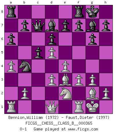 Last move : 0-1 2023 May 18 17:27:32 [Event "FICGS__CHESS__CLASS_B__000365"] [Site "FICGS"] [Date "2023.02.18"] [Round "1"] [White "Bennion,William"] [Black "Faust,Dieter"] [Result "0-1"] [WhiteElo "1972"] [BlackElo "1997"] 1.c4 Nf6 2.Nc3 d6 3.g3 g6 4.Bg2 c5 5.e4 Nc6 6.Nge2 Bg7 7.d3 O-O 8.O-O Bg4 9.f3 Bd7 10.Be3 a6 11.a4 Qc7 12.Nd5 Nxd5 13.cxd5 Nb4 0-1 This chess game has been lost on time (started : 2023.02.18 7:27:13) Follow this game move after move (download)You sit at the board and suddenly your heart leaps. Your hand trembles to pick up the piece and move it. But what Chess teaches you is that you must sit there calmly and think about whether it's really a good idea and whether there are other better ideas. (Stanley Kubrick) Taktik ist was man tun muß, wenn etwas zu tun ist. Strategie ist was man tun muß, wenn nichts zu tun ist. (Savielly Grigorievitsch Tartakower) El ganador de una partida es aquel jugador que hace el penúltimo error. (Savielly Tartakover) Les sacrifices démontrent seulement que quelqu'un a gaffé. (Savielly Tartacover) Fame, I have already. Now I need the money. (an elderly Steinitz)