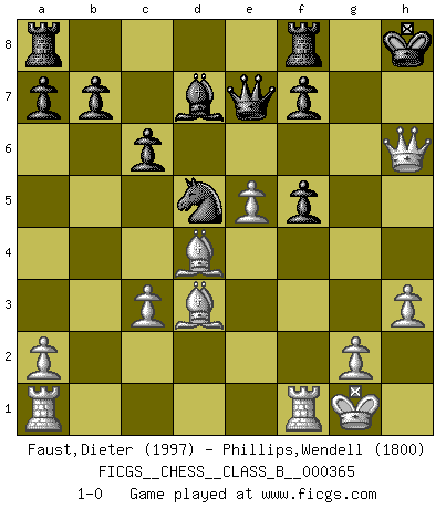 Last move : 1-0 2023 March 27 10:3:7 [Event "FICGS__CHESS__CLASS_B__000365"] [Site "FICGS"] [Date "2023.02.18"] [Round "1"] [White "Faust,Dieter"] [Black "Phillips,Wendell"] [Result "1-0"] [WhiteElo "1997"] [BlackElo "1800"] 1.Nf3 d6 2.d4 c6 3.c4 Nd7 4.Nc3 e5 5.e4 Be7 6.Be3 h6 7.h3 Qc7 8.Bd3 Nf8 9.O-O Ng6 10.c5 Nf6 11.cxd6 Bxd6 12.dxe5 Nxe5 13.Nxe5 Bxe5 14.f4 Bxc3 15.bxc3 O-O 16.Qf3 Be6 17.Bd4 Qe7 18.f5 Bd7 19.e5 Nd5 20.f6 gxf6 21.Qg3+ Kh8 22.Qh4 f5 23.Qxh6+ 1-0 Follow this game move after move (download)Chess is a sea in which a gnat may drink and an elephant may bathe. (Hindu proverb) Wenn es im Universum noch irgendwo intelligente Lebewesen gibt, dann kennen sie Go. (Emanuel Lasker) Jugadores de primera clase pierden en contra de jugadores de segunda clase porque los jugadores de segunda clase a veces juegan una partida de primer clase. (Siegbert Tarrasch) Il n'y a plus de joueurs du niveau de Jacob Murray dont la seule quête est le beau jeu, le plaisir de voir les pièces construire quelque chose. Sur 10 idées à la minute, 9 seront sans intérêt, la dernière s'avèrera géniale. (Christian Bauer) A generalist learns less and less about more and more until he knows nothing about everything. (Author unknown)