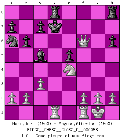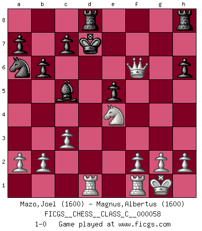 Last move : 1-0 2007 November 17 19:23:58 [Event "FICGS__CHESS__CLASS_C__000058"] [Site "FICGS"] [Date "2007.08.24"] [Round "1"] [White "Mazo,Joel"] [Black "Magnus,Albertus"] [Result "1-0"] [WhiteElo "1600"] [BlackElo "1600"] 1.e4 e5 2.Nf3 d6 3.Bc4 Nf6 4.O-O b6 5.c3 Bb7 6.d4 Bxe4 7.dxe5 dxe5 8.Bxf7+ Kxf7 9.Qxd8 Na6 10.Qd1 Bxf3 11.Qxf3 Rd8 12.Nd2 Bc5 13.Ne4 Ke7 14.Bg5 h6 15.Bxf6+ gxf6 16.Qxf6+ Kd7 17.Rad1+ 1-0 Philidor's defense Kingside Castling by player White (move 4) Player White won this chess game. Follow this game move after move (download)He who takes the Queen's Knight's Pawn will sleep in the streets. (Anonymous) Ich könnte leicht behaupten: Ja,ja, Leonid Breschnew wollte nicht, daß ich Weltmeister werde. In der Tat war die Sache komplizierter. (Viktor Kortschnoi) Aquel que teme a un Peón de Reina aislado, debería de retirarse del Ajedrez. (Siegbert Tarrasch) Horreur, mais aussi harmonie suprême : qu'y avait-il en effet au monde en dehors des échecs ? Le brouillard, l'inconnu, le non-être... (Vladimir Nabokov) I've lost money so fast in these clubs it's left me reeling. I've read every poker book ever written, but the only way to get better at the game is to go out and play with people who are really good. The problem is, you stand to lose a lot of money doing it. (Matt Damon)