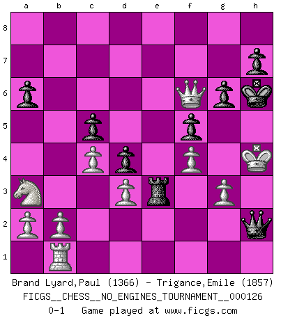 Last move : 0-1 2023 April 21 18:6:27 [Event "FICGS__CHESS__NO_ENGINES_TOURNAMENT__000126"] [Site "FICGS"] [Date "2023.02.19"] [Round "1"] [White "Brand Lyard,Paul"] [Black "Trigance,Emile"] [Result "0-1"] [WhiteElo "1366"] [BlackElo "1857"] 1.e4 e6 2.d3 d5 3.e5 c5 4.Nf3 d4 5.Be2 Bd7 6.O-O Bc6 7.Bd2 g6 8.Re1 Bg7 9.c4 Nd7 10.Bf4 Qc7 11.Na3 a6 12.Rb1 Bxf3 13.Bxf3 Bxe5 14.Bxb7 Ra7 15.Bxe5 Nxe5 16.Qa4+ Ke7 17.Be4 f5 18.Bb7 Qxb7 19.Rxe5 Qb4 20.Qc6 Kf8 21.Qc8+ Kg7 22.Qxe6 Re7 23.Qd6 Rxe5 24.Qxe5+ Nf6 25.Qe7+ Kh6 26.Qxf6 Re8 27.f4 Re1+ 28.Kf2 Qd2+ 29.Kg3 Re3+ 30.Kh4 Qf2+ 31.g3 Qxh2+ 0-1 Follow this game move after move (download)The tactician must know what to do whenever something needs doing; the strategist must know what to do when nothing needs doing. (Savielly Tartakover) Schach ist wie eine schöne Frau, zu der wir ständig zurückkehren, gleichviel, wie oft sie uns zurückweist. (Anonymous) Bobby solo arroja las piezas y solas caen en las casillas correctas. (Miguel Najdorf ) Les erreurs sont comme les malheurs, elles n'arrivent jamais seules. (Siegbert Tarrasch) Computers have lots of memory but no imagination. (Anonymous)