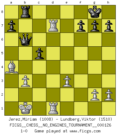Last move : 1-0 2023 July 14 1:41:13 [Event "FICGS__CHESS__NO_ENGINES_TOURNAMENT__000126"] [Site "FICGS"] [Date "2023.02.19"] [Round "1"] [White "Jerez,Miriam"] [Black "Lundberg,Viktor"] [Result "1-0"] [WhiteElo "1008"] [BlackElo "1510"] 1.e4 e5 2.Nf3 Nc6 3.d4 exd4 4.Nxd4 Bc5 5.Be3 Bb6 6.Nxc6 bxc6 7.Nc3 Nf6 8.Bc4 Bxe3 9.fxe3 d5 10.exd5 cxd5 11.Bb5+ Bd7 12.Qd3 c6 13.Ba4 O-O 14.O-O-O Rb8 15.Kb1 Qb6 16.b3 Rfe8 17.Rhe1 Ne4 18.Nxe4 Rxe4 19.c4 Rxc4 20.Qxc4 dxc4 21.Rxd7 cxb3 22.axb3 c5 23.Red1 1-0 Follow this game move after move (download)I have added these principles to the law: get the Knights into action before both Bishops are developed. (Emanuel Lasker) Ich kenne Menschen, die allen Willen der Welt besitzen und doch nicht Schach spielen können. (Robert James Fischer) En manos de Fischer's, una diminuta ventaja teórica es tan buena como tener una Reina de ventaja. (Isaac Kashdan) Comme les marins qui ont mille raisons différentes d'aller en mer, les joueurs d'échecs en ont tout autant avant de s'installer devant une table et jouer... (Vincent Bertignac, philosophe) I take risks, sometimes patients die, but not taking risks causes more patients to die. So I guess my biggest problem is I've been cursed with the ability to do the math. (Gregory House, House M.D.)