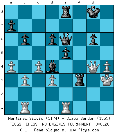 Last move : 0-1 2023 June 5 7:38:29 [Event "FICGS__CHESS__NO_ENGINES_TOURNAMENT__000126"] [Site "FICGS"] [Date "2023.02.19"] [Round "1"] [White "Martinez,Silvio"] [Black "Szabo,Sandor"] [Result "0-1"] [WhiteElo "1174"] [BlackElo "1959"] 1.e4 c5 2.g3 Nc6 3.d3 g6 4.Nf3 Bg7 5.Bg2 d6 6.Nc3 e6 7.O-O Nge7 8.a3 O-O 9.Rb1 b6 10.Bd2 Rb8 11.Re1 Bb7 12.Be3 Nd4 13.Nxd4 cxd4 14.Bxd4 Bxd4 15.Ne2 Bg7 16.Nf4 Qc7 17.c4 Nc6 18.b3 Nd4 19.Ne2 Rbe8 20.Nxd4 Bxd4 21.h4 f5 22.exf5 Rxf5 23.Kh1 Bxg2+ 24.Kxg2 Rxf2+ 25.Kh3 Qf7 26.Qg4 e5 27.a4 h5 28.Qg5 Qe6+ 29.g4 hxg4+ 30.Qxg4 Rf3+ 0-1 Follow this game move after move (download)Chess is life. (Bobby Fischer) Glücklicherweise sind Großmeister Ruben Fines reine Schachbücher weniger phallozentrisch [als seine Schachpsychologie] und deswegen auch weniger lächerlich. (Nigel Short) Una mala movida nulifica cuarenta buenas. (Horowitz) Shah mat. Le roi est mort. Cri de fierté d'un joueur venant de terrasser son adversaire, courtoisement, sans effusion de sang. The worth of a book is to be measured by what you can carry away from it. (James Bryce)