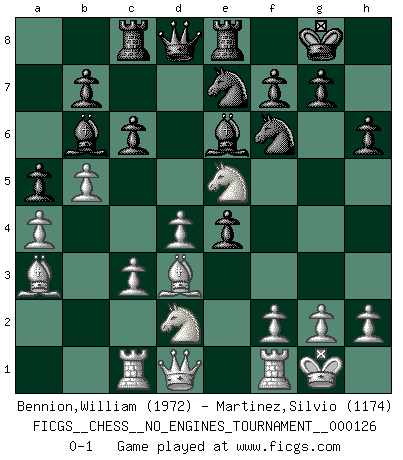 Last move : 0-1 2023 May 20 12:40:40 [Event "FICGS__CHESS__NO_ENGINES_TOURNAMENT__000126"] [Site "FICGS"] [Date "2023.02.19"] [Round "1"] [White "Bennion,William"] [Black "Martinez,Silvio"] [Result "0-1"] [WhiteElo "1972"] [BlackElo "1174"] 1.e4 e5 2.Nf3 Nc6 3.Bc4 Nf6 4.d4 Bb4+ 5.c3 Ba5 6.b4 Bb6 7.a4 a5 8.b5 Ne7 9.Nbd2 c6 10.O-O O-O 11.Nxe5 d5 12.Bd3 h6 13.Ba3 Re8 14.Qb3 Be6 15.Qd1 Rc8 16.Rc1 dxe4 0-1 This chess game has been lost on time (started : 2023.02.19 20:35:45) Follow this game move after move (download)Let the perfectionist play postal. (Yasser Seirawan) Ohne ihre Erfolge schmälern zu wollen würde ich sagen Petrosian, Spassky und Karpov verdanken ihre Siege ihren Trainern - Boleslavsky, Bondarevsky und Furman. (Mikhail Moiseyevich Botvinik) Del Ajedrez se ha dicho que la vida no es lo suficientemente larga para él, pero eso es culpa de la vida, no del Ajedrez. (William Ewart Napier) Roi des jeux et jeu des rois, les échecs portent en eux un sentiment d'infini. Ils donnent à celui qui s'est efforcé d'en approfondir les arcanes l'impression de n'être pas à la mesure de l'homme; en fait, ils constituent un résumé de l'univers, un microcosme, et figurent cette grande échelle qui, dans les plans de la lumière descend jusqu'à la matière, qui des abîmes insondables remonte jusqu'en l'infini de Dieu. (Pyrame) If you are going through hell, keep going. (Winston Churchill)