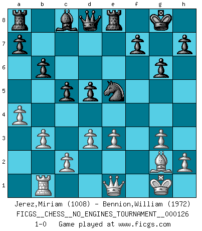 Last move : 1-0 2023 May 22 3:51:17 [Event "FICGS__CHESS__NO_ENGINES_TOURNAMENT__000126"] [Site "FICGS"] [Date "2023.02.19"] [Round "1"] [White "Jerez,Miriam"] [Black "Bennion,William"] [Result "1-0"] [WhiteElo "1008"] [BlackElo "1972"] 1.e4 c5 2.g3 g6 3.Bg2 Nc6 4.Nf3 Bg7 5.Nc3 e6 6.O-O Nge7 7.d3 O-O 8.a4 d5 9.exd5 exd5 10.Re1 b6 11.b3 Bxc3 12.Bh6 Re8 13.Ne5 Nxe5 14.Rb1 Bxe1 15.Qxe1 Nf5 16.Be3 Nxe3 17.fxe3 1-0 This chess game has been lost on time (started : 2023.02.19 20:35:45) Follow this game move after move (download)Chess holds its master in its own bonds, shackling the mind and brain so that the inner freedom of the very strongest must suffer. (Albert Einstein) Die unerbitterlichsten Regeln im Schach sind die Ausnahmen. (Savielly Grigorievitsch Tartakower) Nada excita más a Grandes Maestros aburridos que una novedad teórica. (Dominic Lawson) Le jeu d'échecs est comme rejeté hors du temps. (Antoine de Saint-Exupéry) O divine art of subtlety and secrecy! Through you we learn to be invisible, through you inaudible and hence we can hold the enemy's fate in our hands. (Sun Tzu)