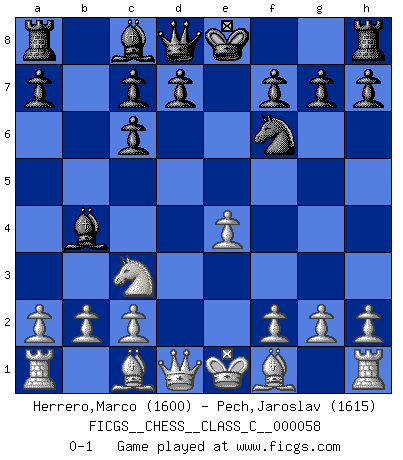 Last move : 0-1 2007 October 19 7:13:37 [Event "FICGS__CHESS__CLASS_C__000058"] [Site "FICGS"] [Date "2007.08.24"] [Round "1"] [White "Herrero,Marco"] [Black "Pech,Jaroslav"] [Result "0-1"] [WhiteElo "1600"] [BlackElo "1615"] 1.e4 e5 2.Nc3 Nf6 3.Nf3 Nc6 4.d4 exd4 5.Nxd4 Bb4 6.Nxc6 bxc6 0-1 This chess game has been lost on time (started : 2007.08.24 17:49:0) Vienna : Falkbeer variation Player Black won this chess game. Follow this game move after move (download)What is the difference between chess and football? Everybody understands football, but nobody plays it. Everybody plays chess, but nobody understands it. Everything is relative. (Vladimir Kramnik) Weshalb minderdergeübte Spieler mit g2-g4 beginnen? Die betreffenden sind unschlüssig, ob sie nun rechts (h4) oder links (f4) beginnen sollen, und in ihrer Ratlosigkeit entschliessen sie sich nach guter Bürgerart dazu, den goldenen Mittelweg zu wählen. (Aaron Nimzowitsch) Yo he agregado estos principios a la ley: pongan los Caballos en acción antes de que los dos Alfiles sean desarrollados. (Emanuel Lasker) Une platitude souvent récitée à propos des Echecs est qu'une des choses les plus difficiles à réaliser est de gagner une position gagnante. Cela ne manque pas de sens mais, pour ma part, j'ai toujours trouvé plus difficile de gagner une position perdante. (Tim Krabbe) If you are going through hell, keep going. (Winston Churchill)