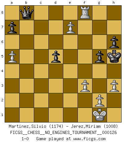 Last move : 1-0 2023 April 8 17:9:21 [Event "FICGS__CHESS__NO_ENGINES_TOURNAMENT__000126"] [Site "FICGS"] [Date "2023.02.19"] [Round "1"] [White "Martinez,Silvio"] [Black "Jerez,Miriam"] [Result "1-0"] [WhiteElo "1174"] [BlackElo "1008"] 1.e4 e5 2.Nf3 Nc6 3.Bb5 Nf6 4.Nc3 Bb4 5.O-O O-O 6.Re1 d5 7.a3 Bc5 8.Bxc6 bxc6 9.exd5 cxd5 10.Nxe5 Bb7 11.d4 Bb6 12.h3 Re8 13.b4 h6 14.a4 c6 15.a5 Bc7 16.Bf4 Ba6 17.Nxc6 Qd7 18.Rxe8+ Qxe8 19.Ne5 Bb5 20.Nxb5 Qxb5 21.c3 Ne4 22.Nxf7 Bxf4 23.Ne5 Bxe5 24.dxe5 Rf8 25.f3 Nxc3 26.Qb3 Kh8 27.Rc1 g5 28.Qxc3 Rf4 29.e6 Kg8 30.Qc8+ Kg7 31.Rc7+ Kg6 32.Qg8+ Kh5 33.Qf7+ Rxf7 34.Rxf7 Qxb4 35.e7 Qb8 36.Rf8 1-0 Follow this game move after move (download)Every Chess master was once a beginner. (Chernev) Ja, jede Frau in Holland liebt mich bestimmt, und alle Männer hassen mich. (Loek van Wely) El Ajedrez es realmente noventa y nueve por ciento calculación. (Soltis) La conception d'un plan est le processus par lequel un joueur exploite les avantages de sa position tout en s'efforçant d'en réduire au minimum les inconvénients. Afin de garantir le succès, un plan doit toujours se fonder sur un diagnostic objectif des particularités d'une position. La conception d'un plan est d'autant plus difficile que la position est équilibrée, et grandement facilitée lorsqu'il n'existe qu'un seul plan susceptible de répondre aux exigences de la position. (Harry Golombek) If only faces could talk... (Pat Summerall, Sportscaster during the Super Bowl)