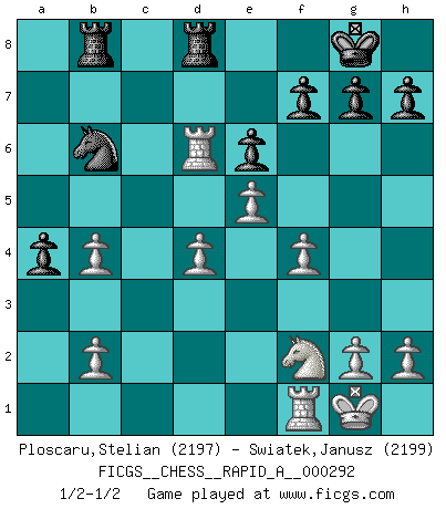 Last move : 1/2-1/2 2023 May 8 10:18:50 [Event "FICGS__CHESS__RAPID_A__000292"] [Site "FICGS"] [Date "2023.02.21"] [Round "1"] [White "Ploscaru,Stelian"] [Black "Swiatek,Janusz"] [Result "1/2-1/2"] [WhiteElo "2197"] [BlackElo "2199"] 1.e4 e6 2.d4 d5 3.Nc3 Nf6 4.e5 Nfd7 5.f4 c5 6.Nf3 Nc6 7.Be3 a6 8.Qd2 Be7 9.Be2 O-O 10.O-O b5 11.a3 Qb6 12.Nd1 a5 13.c3 a4 14.Bd3 Ba6 15.Nf2 cxd4 16.Nxd4 Bc5 17.Rae1 Bxd4 18.Bxd4 Nxd4 19.cxd4 b4 20.Qxb4 Qxb4 21.axb4 Bc4 22.Bxc4 dxc4 23.Rc1 Rfd8 24.Rxc4 Nb6 25.Rc6 Rab8 26.Rd6 1/2-1/2 Follow this game move after move (download)We must make sure that Chess will not be like a dead language, very interesting, but for a very small group. (Sytze Faber) Im Wettkampf zwischen starken Meistern kommen Fehler sehr selten vor, deshalb ist es mit bloßem Warten nicht getan. (José Raúl Capablanca) Con el tiempo, empecé a progresar en partidas decisivas. Tal vez porque me di cuenta de una simple verdad: no solo estaba yo nervioso sino también mi oponente. (Mikhail Tal) Aux échecs, les retours au sommet sont rares : les dommages psychologiques consécutifs à une défaite sont trop sévères. (Daily Telegraph) Cactus - It is depressed cucumber. (Ilmars Cirulis)