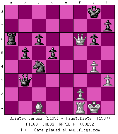 Last move : 1-0 2023 April 16 9:36:8 [Event "FICGS__CHESS__RAPID_A__000292"] [Site "FICGS"] [Date "2023.02.21"] [Round "1"] [White "Swiatek,Janusz"] [Black "Faust,Dieter"] [Result "1-0"] [WhiteElo "2199"] [BlackElo "1997"] 1.e4 e5 2.Nf3 Nc6 3.Bb5 a6 4.Ba4 Nge7 5.c3 g6 6.d4 exd4 7.cxd4 b5 8.Bc2 d5 9.e5 Bg7 10.h3 O-O 11.a4 Bf5 12.O-O Bxc2 13.Qxc2 f6 14.axb5 axb5 15.Rxa8 Qxa8 16.exf6 Rxf6 17.Qd3 Qf8 18.Nbd2 Nf5 19.Nb3 Qb4 20.g4 Nd6 21.Ne5 Nc4 22.Nxc6 Rxc6 23.Nc5 Bxd4 24.Na6 Rxa6 25.Qxd4 c6 26.b3 Qxb3 27.Qf6 1-0 Follow this game move after move (download)Nonsense was the last thing Fischer was interested in, as far as Chess was concerned. (Elie Agur) Fischer machte Schach einfach zu einer aufregenden Sache, wann immer er sich ans Brett setzte. (Raymond Keene) Todos los Maestros de Ajedrez fueron un día unos principiantes. (Chernev) Un journaliste : 'Vous préférez avoir une dame de plus sur l'échiquier ou au lit ?' Boris Spassky : 'Ca dépend de la position.' Every vice is only an exaggeration of a necessary and virtuous function. (Ralph Waldo Emerson, Journals 1936)