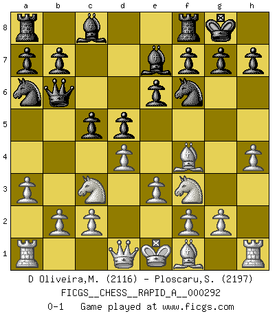 Last move : 0-1 2023 April 24 17:53:49 [Event "FICGS__CHESS__RAPID_A__000292"] [Site "FICGS"] [Date "2023.02.21"] [Round "1"] [White "D Oliveira,Marcos Arruda"] [Black "Ploscaru,Stelian"] [Result "0-1"] [WhiteElo "2116"] [BlackElo "2197"] 1.d4 d5 2.Nc3 Nf6 3.Bf4 e6 4.Nb5 Na6 5.e3 Be7 6.Nf3 O-O 7.h4 c6 8.Nc3 Qb6 9.a3 c5 0-1 This chess game has been lost on time (started : 2023.02.21 15:25:36) Follow this game move after move (download)Do you realize Fischer almost never has any bad pieces? He exchanges them, and the bad pieces remain with his opponents. (Yuri Balashov) Ich erzeugte keinen Neid, da mich die Schachspieler als Musiker und die Musiker als Schachspieler betrachteten. (Mark Taimanov) La batalla por la última verdad nunca sera ganada. Y es por eso que el Ajedrez es tan fascinante. (Hans Kmoch) Lorsque vous vous retrouvez devant une position atroce, ne tendez pas un ultime piège dérisoire avec l'intention d'abandonner si l'adversaire le déjoue ! Faites-vous plutôt un devoir de résister comme si votre vie en dépendait. Jouez le coup qui vous déplairait au centuple si vous étiez dans la peau de votre tortionnaire ! Remember : Your focus determines your reality. (Qui-Gon Jinn in Star Wars ep.1)