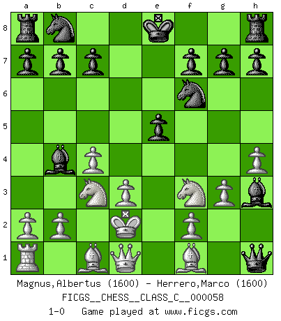 Last move : 1-0 2007 October 11 12:23:35 [Event "FICGS__CHESS__CLASS_C__000058"] [Site "FICGS"] [Date "2007.08.24"] [Round "1"] [White "Magnus,Albertus"] [Black "Herrero,Marco"] [Result "1-0"] [WhiteElo "1600"] [BlackElo "1600"] 1.h4 e5 2.e4 d6 3.g3 Nf6 4.d3 d5 5.exd5 Qxd5 6.c4 Qxh1 7.Nf3 Bh3 8.Kd2 Bb4+ 9.Nc3 1-0 This chess game has been lost on time (started : 2007.08.24 17:49:0) Anti-Borg (Desprez) Opening Player White won this chess game. Follow this game move after move (download)Human affairs are like a Chess game: only those who do not take it seriously can be called good players. (Hung Tzu Ch'eng) Kleine Schachspieler machen Mist, und große Schachspieler machen Mist, aber große machen weniger Mist. (Fritz Sämisch) Nada excita más a Grandes Maestros aburridos que una novedad teórica. (Dominic Lawson) Le jeu d'échecs est comme rejeté hors du temps. (Antoine de Saint-Exupéry) Now the reason the enlightened prince and the wise general conquer the enemy whenever they move and their achievements surpass those of ordinary men is foreknowledge. (Sun Tzu)