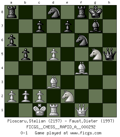 Last move : 0-1 2023 May 20 23:54:17 [Event "FICGS__CHESS__RAPID_A__000292"] [Site "FICGS"] [Date "2023.02.21"] [Round "1"] [White "Ploscaru,Stelian"] [Black "Faust,Dieter"] [Result "0-1"] [WhiteElo "2197"] [BlackElo "1997"] 1.d4 d6 2.e4 g6 3.Nc3 Nf6 4.Be3 a6 5.h3 Bg7 6.f4 O-O 7.Nf3 b5 8.e5 Nfd7 9.h4 h5 10.g4 hxg4 11.h5 Bb7 12.Ng5 dxe5 13.hxg6 exf4 14.Qxg4 Nf6 15.gxf7+ Rxf7 16.Qe6 Qe8 17.Bd3 Nc6 18.Qh3 Nd8 19.Bxf4 Bxh1 20.Qxh1 Qc6 21.d5 Qd7 22.O-O-O Qg4 23.Ne2 Qh5 24.Qf1 Rf8 0-1 Follow this game move after move (download)Man is a frivolous, a specious creature, and like a Chess player, cares more for the process of attaining his goal than for the goal itself. (Dostoyevsky) Es ist wirklich schade, dass so viele Schachspieler nicht auf ihr Äußeres achten! (Alexandra Kosteniuk) El pensamiento metódico es mas útil en el Ajedrez que la inspiración. (C. J. S. Purdy) Je crois qu'il existe des manières très spécifiques de jouer efficacement contre une machine. Evidemment, nous n'avons aucune chance en technique pure, parce que l'ordinateur calcule de manière parfaite. Mais lorsque nous faisons appel à notre cerveau, en utilisant l'intuition et la compréhension, alors nous restons beaucoup plus forts. (Anatoli Karpov) Pushing plastic is for the many, pushing virtual pieces is for the fewer, pushing wood is for the very few. (Normajean Yates)